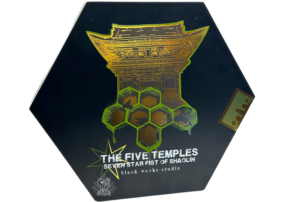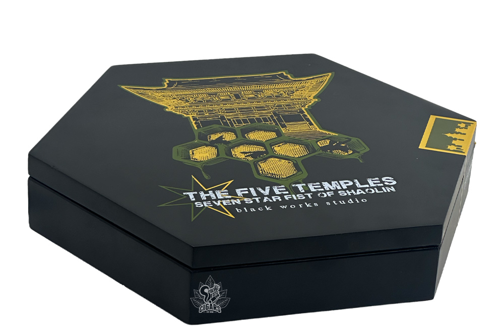 Inside the hexagonal display are seven unique cigars, each housed in its own cell, evoking the structure of a beehive or temple floor. The set pulls from three BLK WKS sub-lines: Killer Bee, The Hornet, and the elusive Shaolin. You get three Killer Bee pyramids (Connecticut, maduro, and Sumatra), two Hornet pyramids (Pennsylvania Broadleaf and San Andrés), and two Shaolin belicosos, each sporting a decorative wrapper design with contrasting leaves spiraling the cigars in unique patterns.